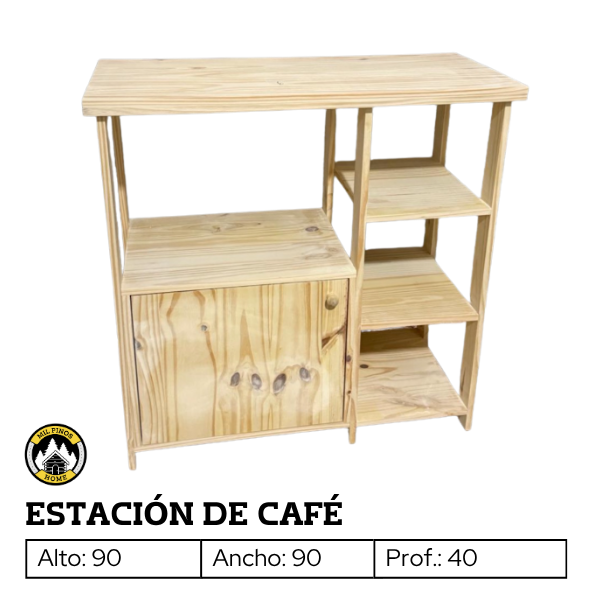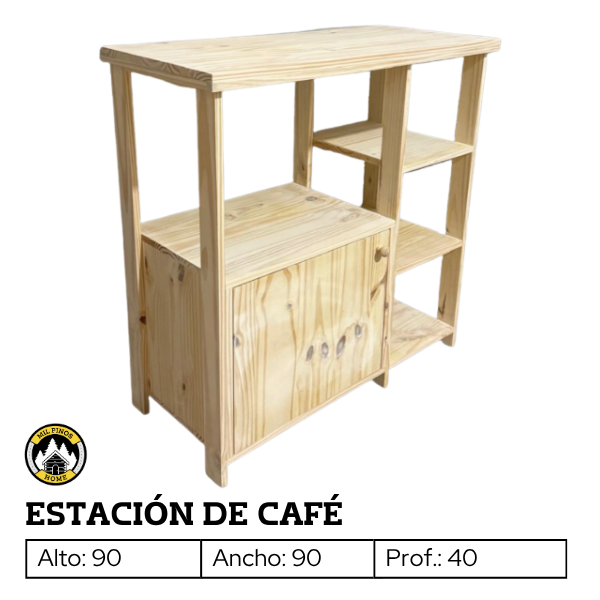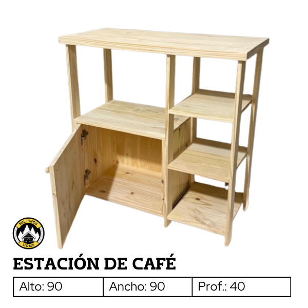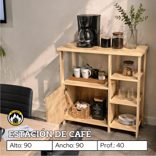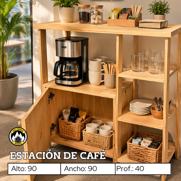 Crea un rincón especial con esta estación de café, diseñada para organizar de manera práctica cafetera, pocillos, platos y todos los implementos necesarios para preparar y disfrutar tu café, mate o té.