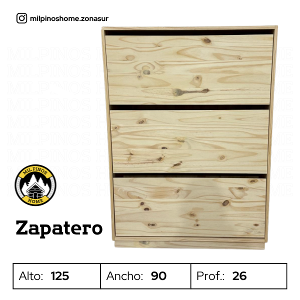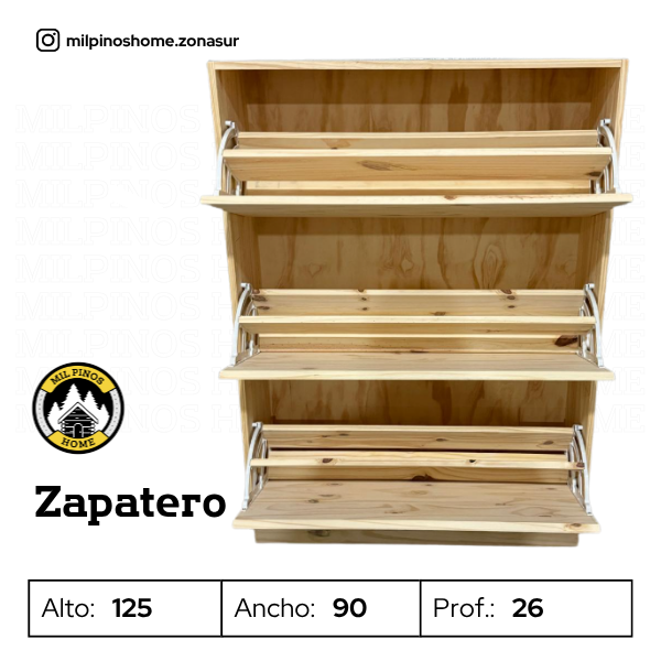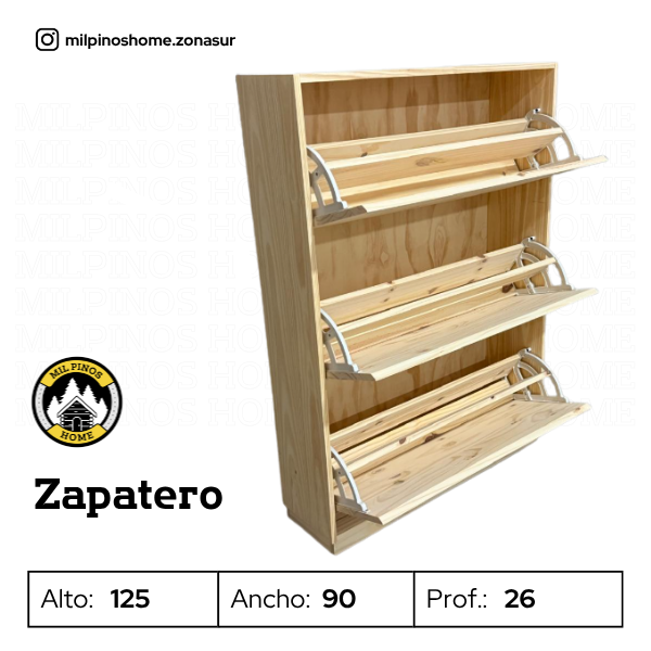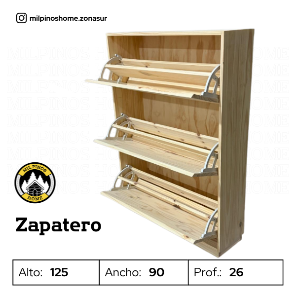 Ahorrá espacio con este zapatero para 18 pares aproximadamente, práctico y funcional. La madera de pino es con nudos y vetas. Se entrega masillado y lijado, listo para pintar.