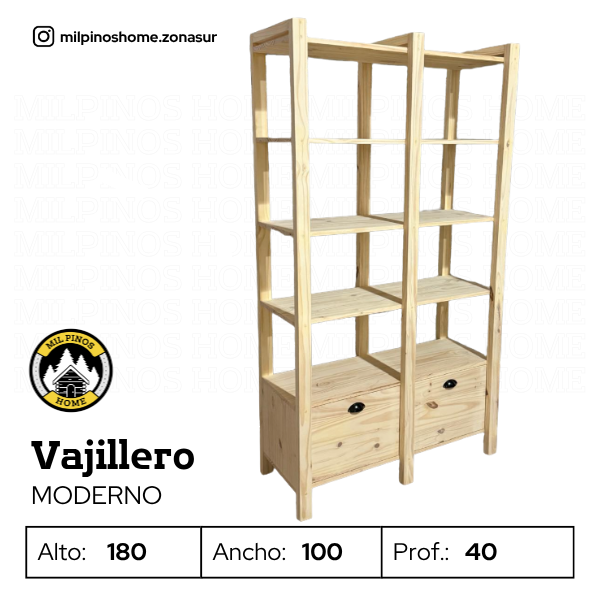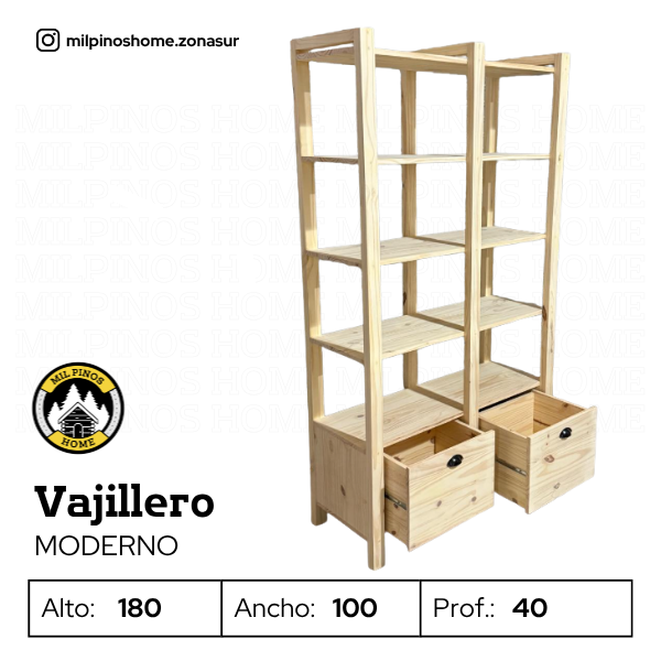 Hermoso vajillero moderno que podés utilizar para cualquier otro uso, en cualquier espacio de tu hogar o negocio. Dos cajones con guías metálicas. La madera de pino es con nudos y vetas. Se entrega masillado y lijado, listo para pintar.